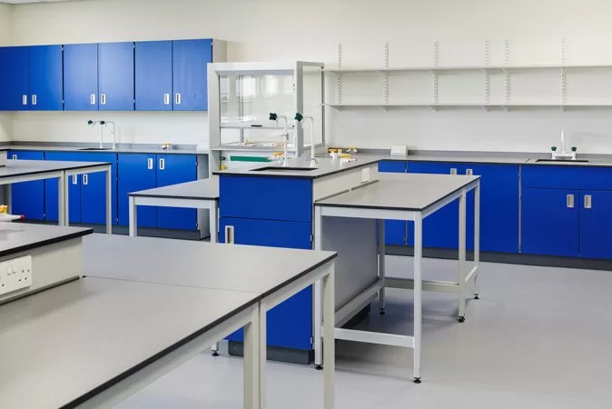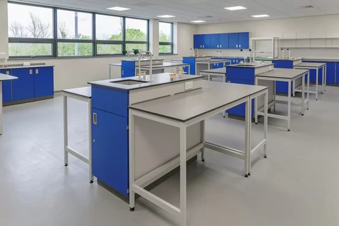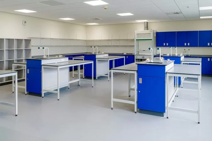 The tough APMG fitted furniture is for three new school labs. These are situated above the newbuild sports hall and fitness suite completed by Collinson Construction. In addition to the labs, APMG has also fitted out the science prep room.